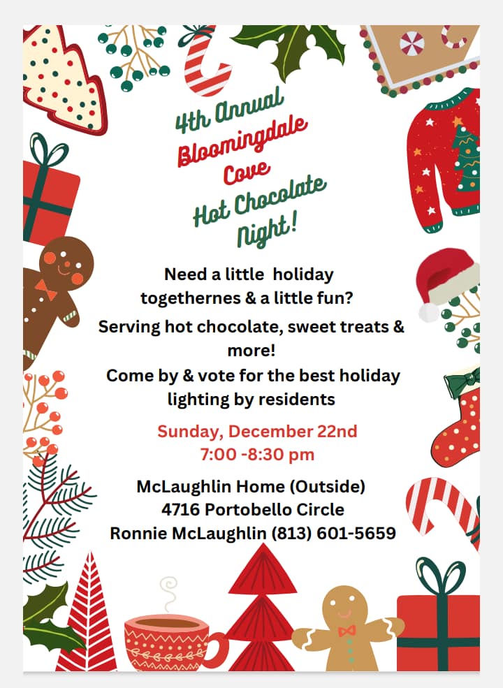 Hot Chocolate Night! Posted on December 11, 2024December 11, 2024 by Darcie Arent Come join us and hang with your 80+ neighbors who came last year! It was so fun! Text me with any questions! No need to rsvp. This is our way of giving back to our neighborhood that we love.